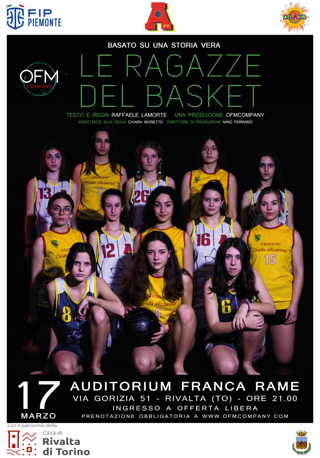 In scena venerdì 17 marzo 2023, all’Auditorium “Franca Rame” di Rivalta “Le Ragazze del Basket” di Raffaele Lamorte autore e regista coadiuvato da Chiara Moretto con la supervisione di Nino Ferraro che ne è anche direttore di produzione. Lo spettacolo realizzato in collaborazione con Atlavir Rivalta e AreaPro2020 ha il patrocinio della Città di Rivalta