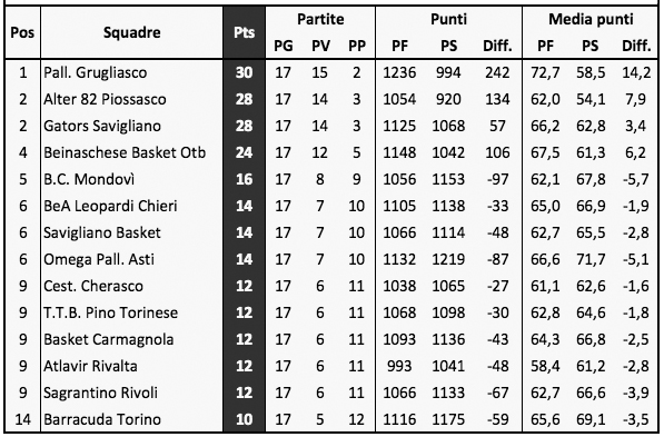 Pino Torinese: Pino Torinese: Miglio, D’Emanuele ne, Corrocher 16, Dho 8, Ascheri ne, Sisti 5, Cochis 10, Proto 8, Peirani, Panato 2. All. Rizzitiello